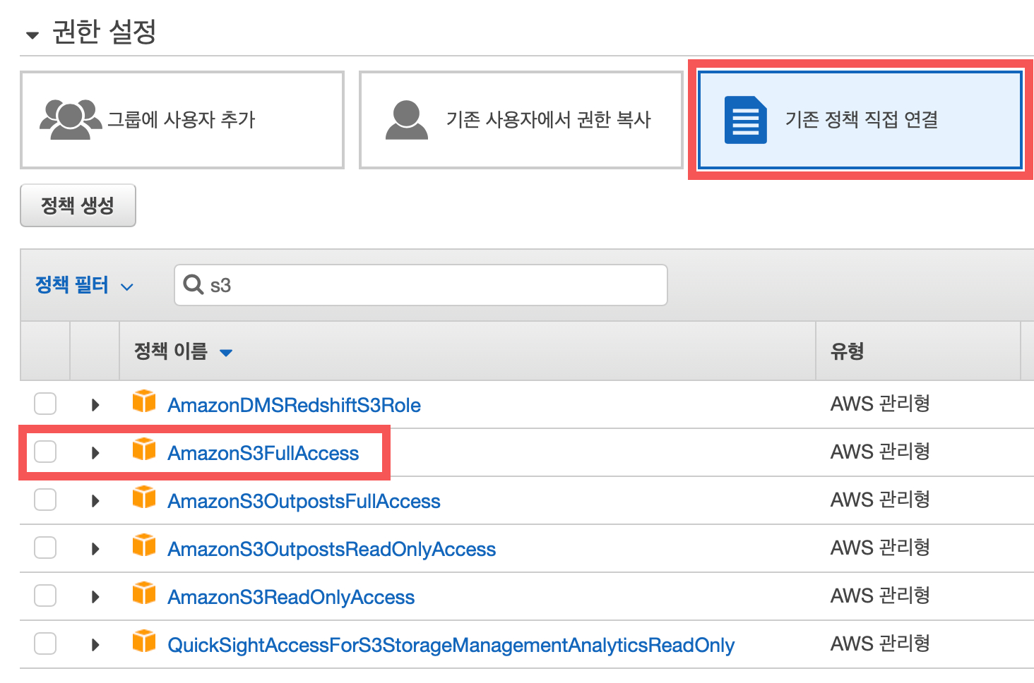 이제 권한을 설정합니다. 그룹을 하나 만들어서 거기에 유저를 추가해도 좋고, 아니면 기존 정책에 직접 연결을 사용해서 바로 적용해도 됩니다. 앞으로 유저가 많아지면 그룹으로 관리하는 게 좋겠지만 여기서는 "기존 정책에 직접 연결"을 해보겠습니다.