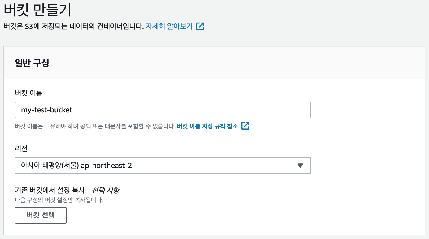 일반 구성에는 버킷 이름과 리전이 있는데 버킷 이름은 중복이 되지 않도록 소문자로 작성을 해주시면 됩니다. 우리는 서울에 사니까 리전은 서울로 자동선택되어 있을 거예요. 원하시는 곳을 지정하면 됩니다.